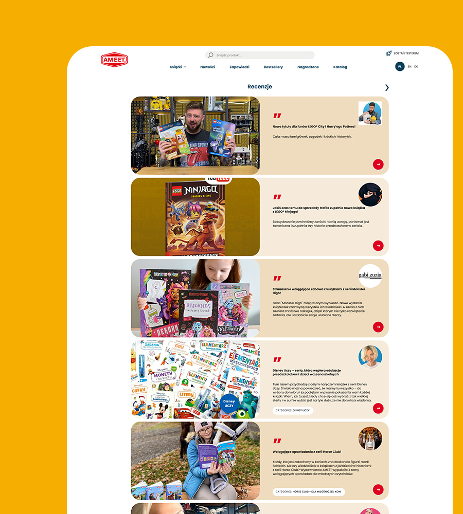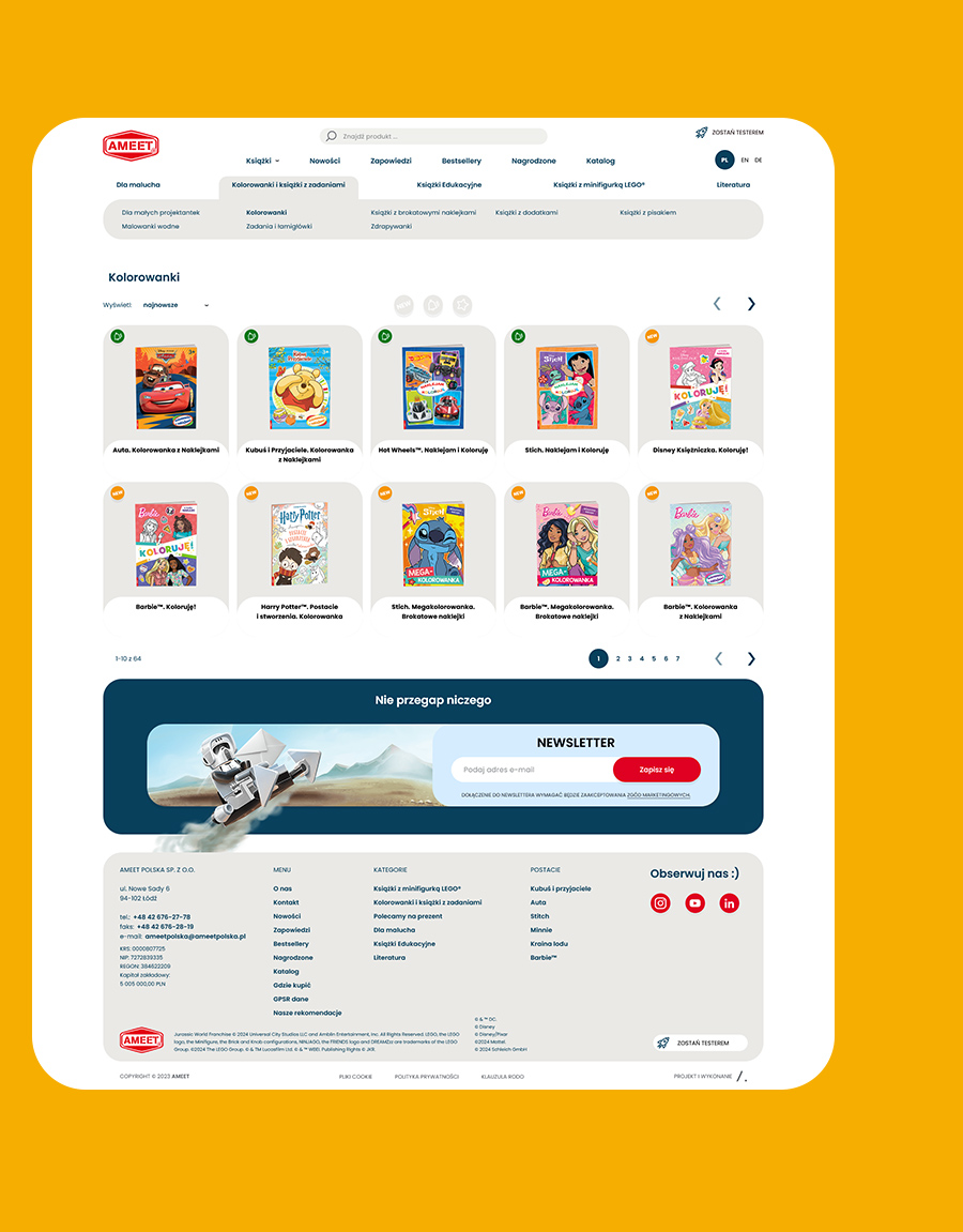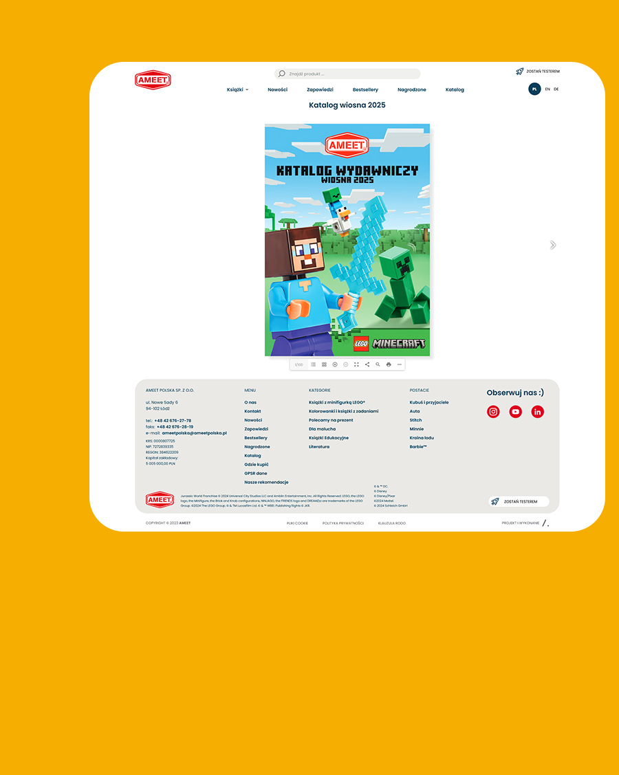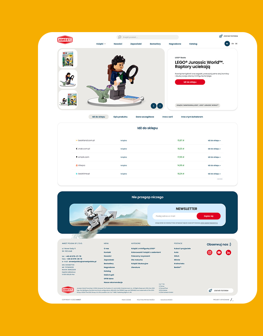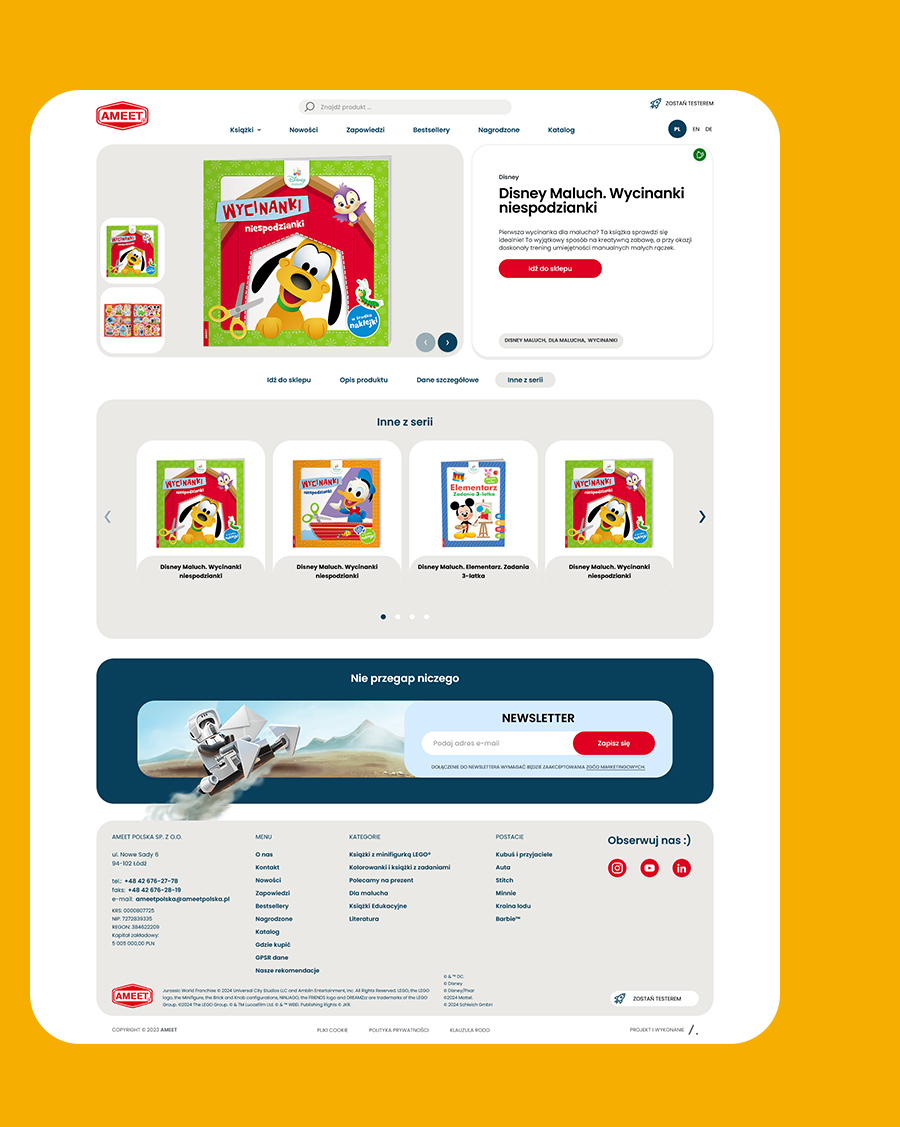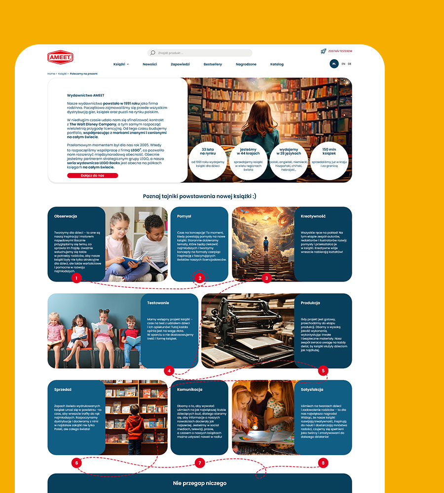 Wciągająca jak najlepsza książka, nowa strona Wydawnictwa Ameet Polska przenosi użytkowników w świat inspiracji i doskonałego designu. Jako strategiczny partner LEGO, Ameet potrzebowało platformy, która połączy prestiż marki z intuicyjnym dostępem do oferty.