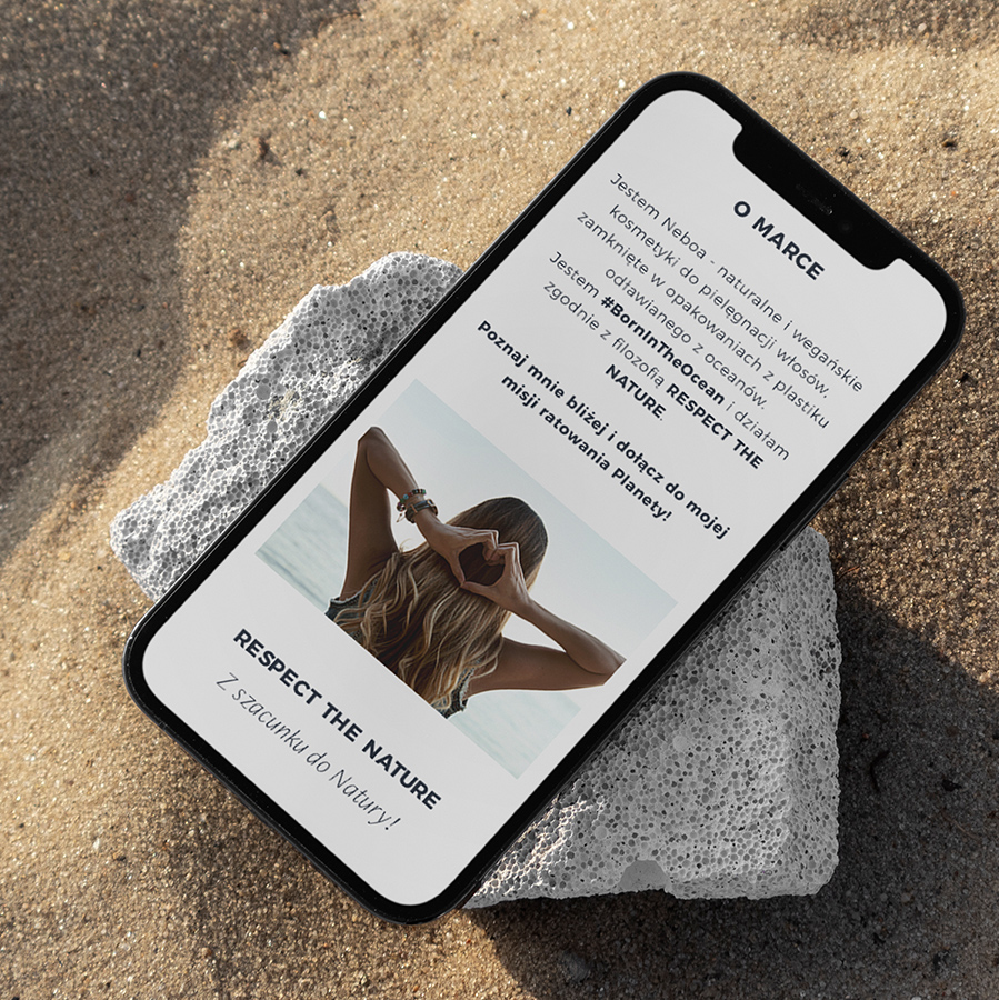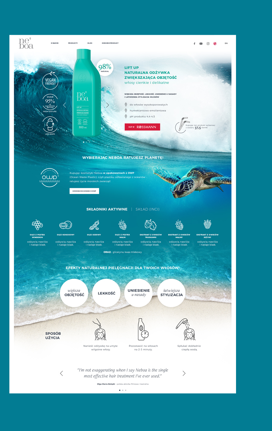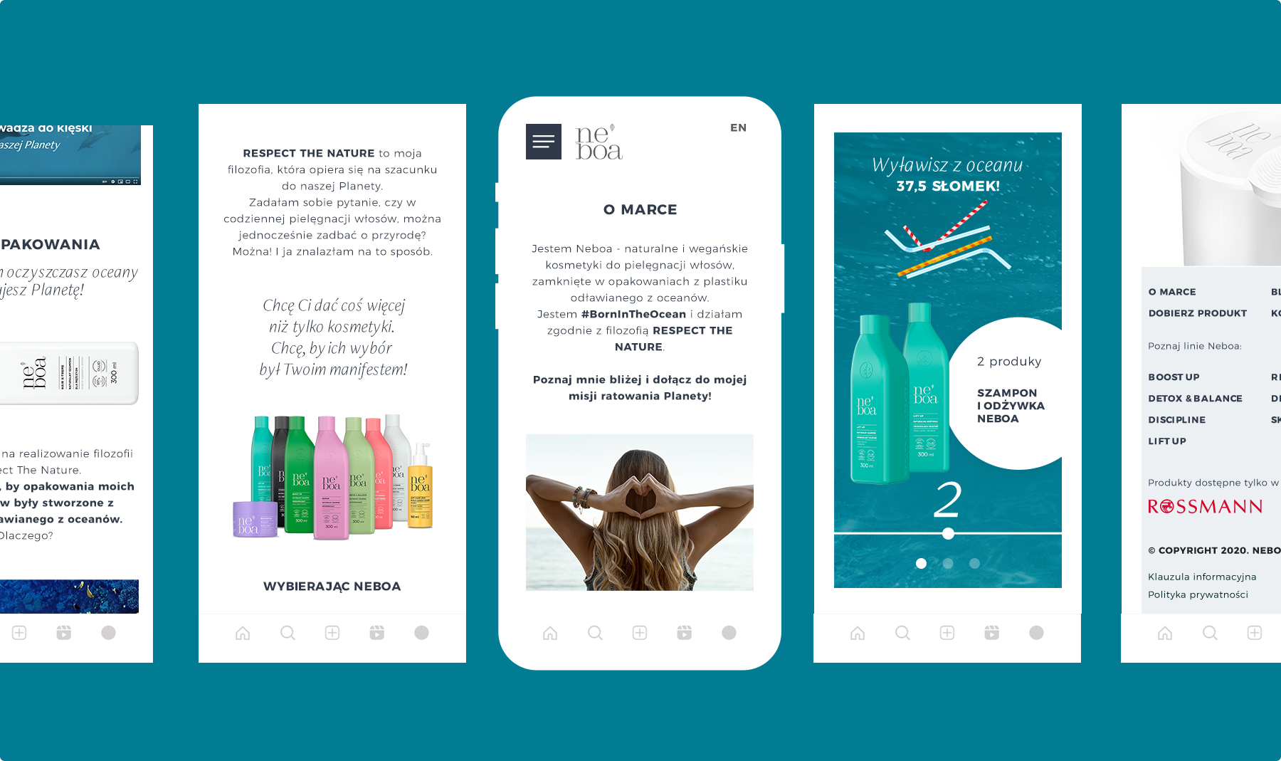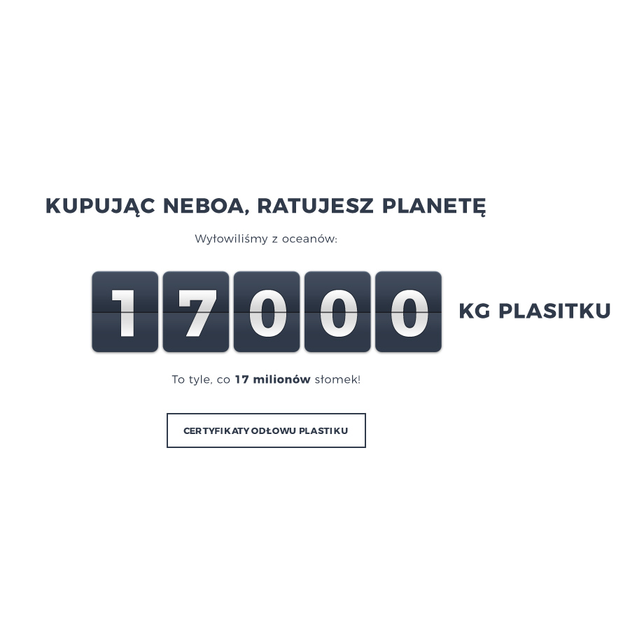 Licznik wydobycia ton plastiku z oceanów Dla Neboa stworzyliśmy stronę internetową, która nie tylko prezentuje ofertę, ale przede wszystkim opowiada historię – o świadomej pielęgnacji i trosce o środowisko. Kluczowym elementem projektu było pokazanie realnego wpływu działań marki, dlatego już na stronie głównej znalazł się licznik pokazujący, ile ton plastiku udało się odzyskać z oceanów.