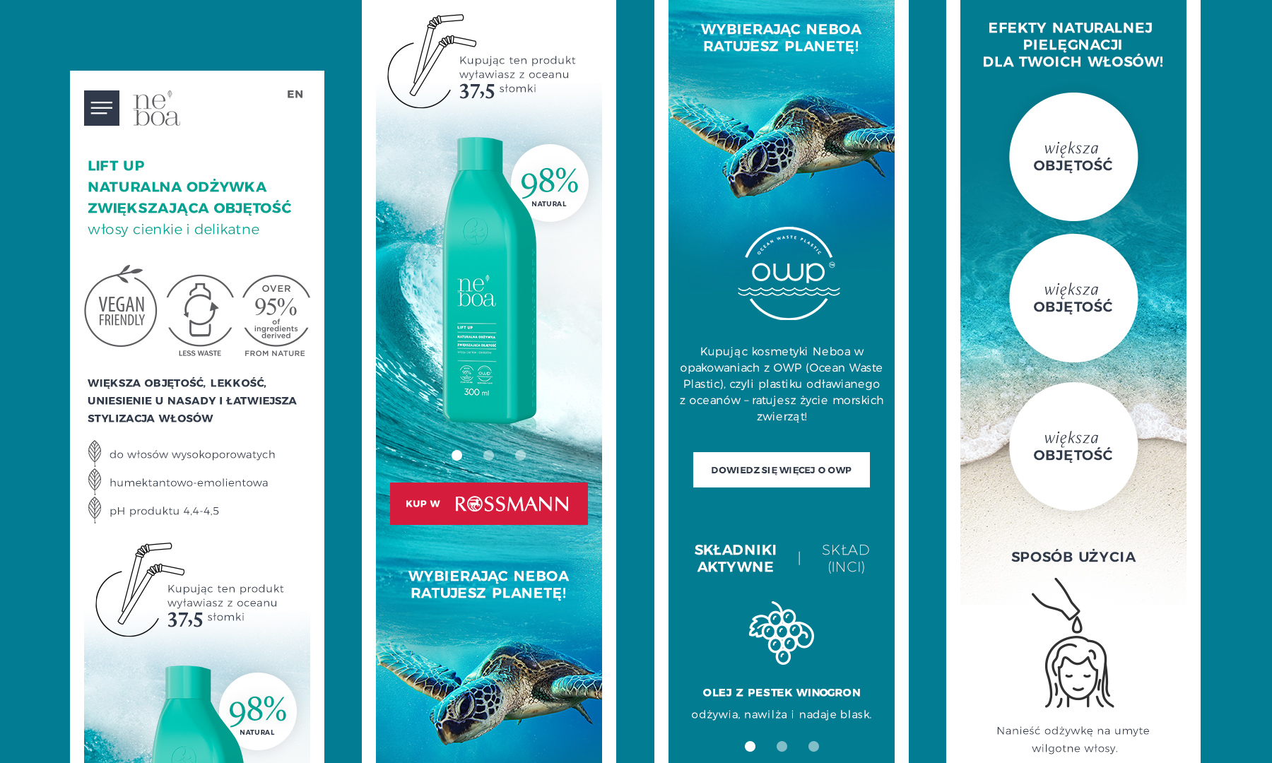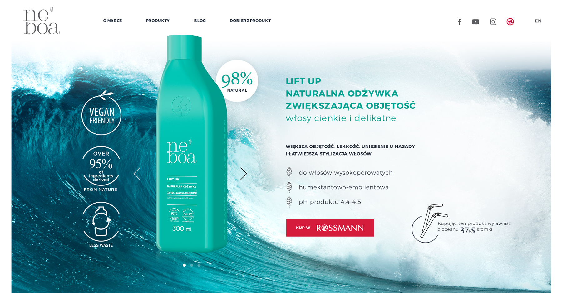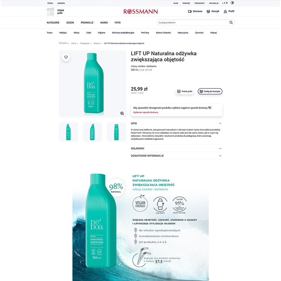 Budując nową stronę dla Neboa postawiliśmy na rich content – atrakcyjne, rozbudowane treści, które pozwalają lepiej zaprezentować produkty i wartości marki. Zamiast standardowych kart produktowych, każda strona została zaprojektowana tak, by angażować użytkowniczki na różnych etapach decyzji zakupowej. Krótkie komunikaty, grafiki i język korzyści trafiają do tych, które chcą szybko podjąć decyzję, a jednocześnie nie brakuje treści dla bardziej dociekliwych włosomaniaczek, które chcą wiedzieć wszystko – od składu po sposób działania. Dzięki temu zakupy stają się bardziej świadome, a całość lepiej oddaje filozofię Neboa – w trosce o włosy i o naturę.