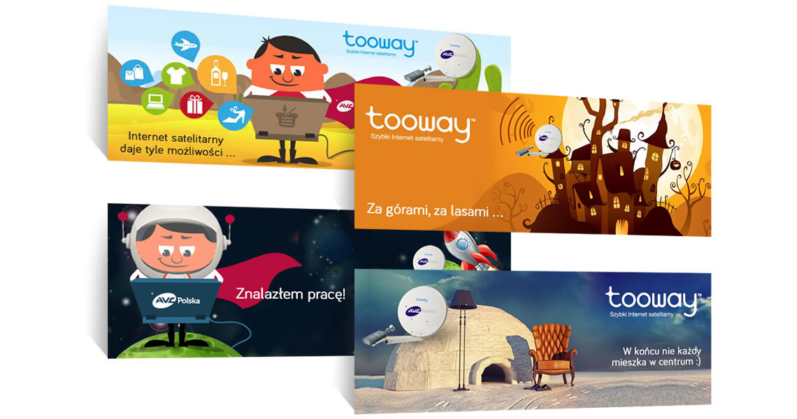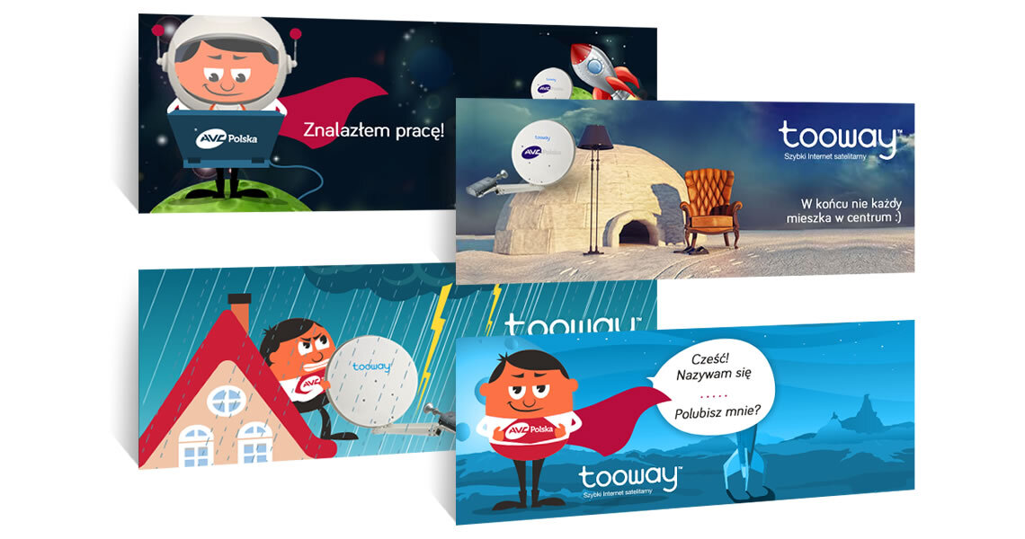 a wraz z nią polscy dostawcy usług. To właśnie niezawodność zasięgu gdziekolwiek jesteś, stała się głównym motywem 6 banerów, które mieliśmy przyjemność przygotować dla AVC Polska. Każdy baner to inne miejsce, do którego bez problemu dotrze Internet satelitarny. Na tę okazję przygotowaliśmy również brand hero – Satelitomaniaka, który zagościł na większości grafik.