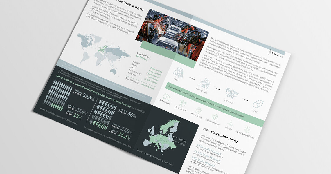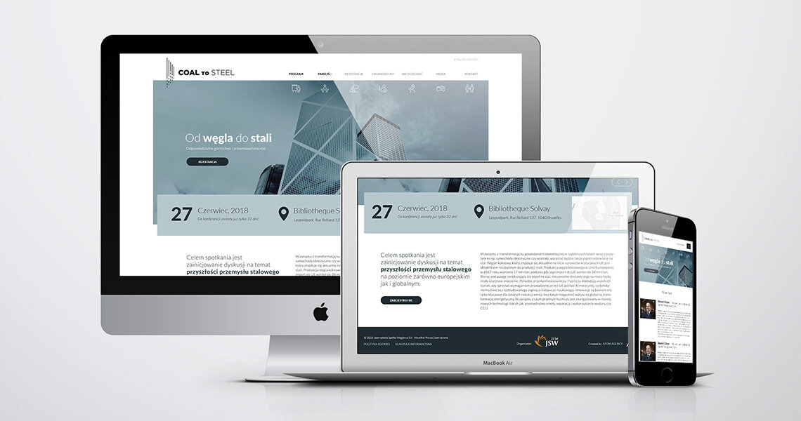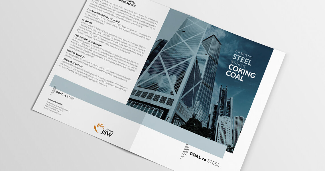 Na początku czerwca 2018 roku Agencja ATOM rozpoczęła współpracę z Jastrzębską Spółką Węglową – największym producentem węgla koksowego w Unii Europejskiej. Naszym zadaniem było opracowanie pełnej koncepcji graficznej międzynarodowej konferencji „From Coal to Steel”, która odbyła się niespełna miesiąc później w Brukseli. Realizacja wymagała więc od nas wyjątkowej sprawności, perfekcji i szybkości działania. Podstawą kolejnych projektów było stworzenie tzw. key visual. Oryginalne logo, kolorystyka, dobór fontu – tym wszystkim zajął się zespół naszych grafików. Na bazie koncepcji głównej przygotowaliśmy layout strony internetowej oraz wszelkie drukowane materiały i gadżety konferencyjne – roll-upy, teczki, papier firmowy, długopisy, smycze oraz imienne plakietki. Byliśmy również odpowiedzialni za przygotowanie oraz druk folderu informacyjnego. Spotkanie zgromadziło przedstawicieli wysokich władz UE oraz ekspertów sektora stalowego z Europy, Chin oraz Indii, którzy dyskutowali o przyszłości przemysłu stalowego na świecie, korzystając z przygotowanych przez nas materiałów.