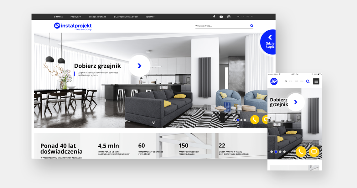 INSTAL-PROJEKT posiada ponad 40 lat doświadczenia w zapewnianiu niezawodnych rozwiązań z zakresu asortymentu grzewczego. Głównym wyzwaniem podczas tworzenia strony internetowej było więc efektowne zaprezentowanie przewag konkurencyjnych firmy. Z myślą o bogatym asortymencie skupiliśmy się też na wprowadzeniu struktury sprzyjającej dostarczaniu użytkownikowi zrozumiałych informacji.