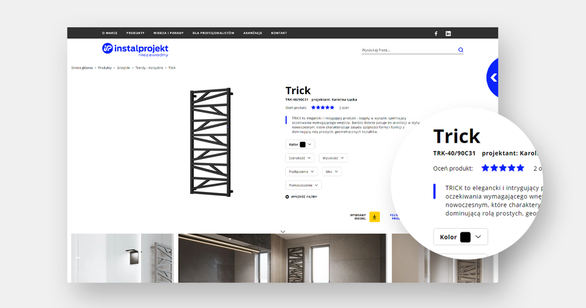 Centrum strony stanowi moduł produktowy wraz z rozbudowaną filtracją produktów. Użytkownik może dokonać wyboru na podstawie parametrów zarówno technicznych, jak i kolorystycznych. Przygotowany został również drugi moduł produktowy. Na podstawie uwzględnionych w nim wskazówek potencjalny klient wybierze grzejnik adekwatnie do swoich potrzeb. Zrobi to szybko i wygodnie, w czasie rzeczywistym, bez konieczności posiadania rozbudowanej wiedzy.