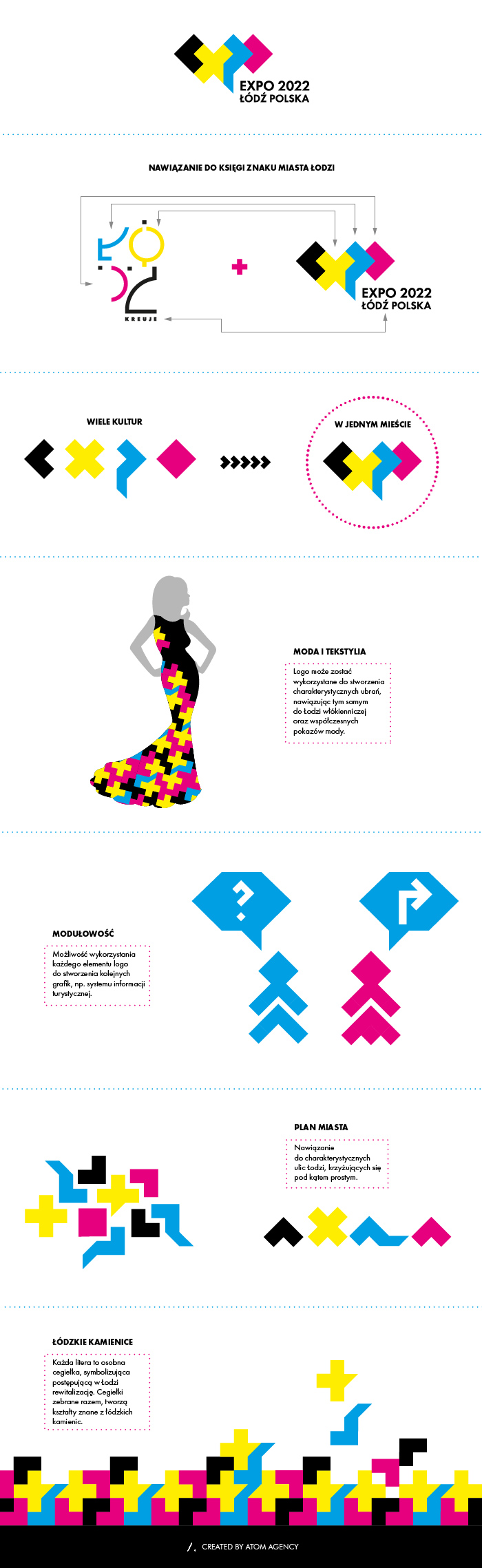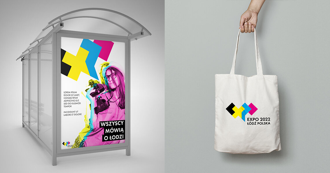 Projektując logo, chcieliśmy zmieścić w nim bogatą symbolikę, jednocześnie pozostając w syntetycznej formie, znanej z prac Kobro czy Strzemińskiego. Logo, charakteryzuje się nowoczesną i dynamiczną formą, która nawiązuje do prężnych zmian zachodzących w Łodzi. Cztery kolory reprezentują różne kultury, nierozerwalnie złączone z historią miasta i oddające jego niepowtarzalny charakter. Znak został zbudowany z odrębnych cegiełek, odzwierciedlających architektoniczne kształty łódzkich kamienic i ulic. Poszczególne klocki wydają się przytulać do siebie, sugerując współpracę i otwartość na gości, którzy odwiedzą Łódź w czasie Expo 2022. Całość, została ubrana w charakterystyczny krój, nawiązujący do księgi znaku Miasta Łodzi.