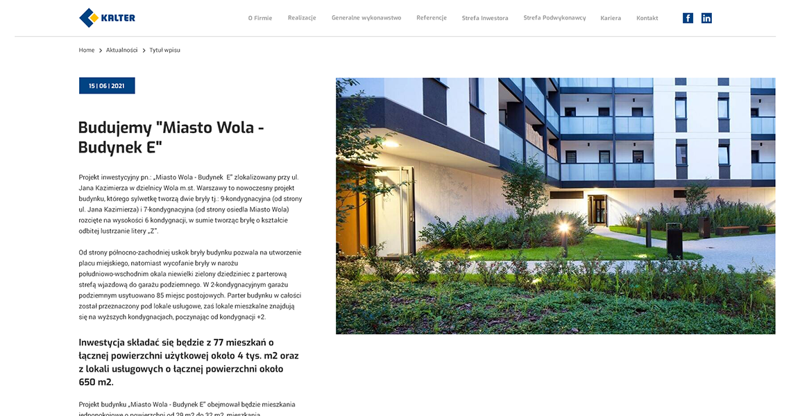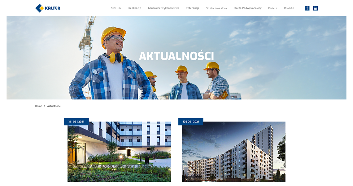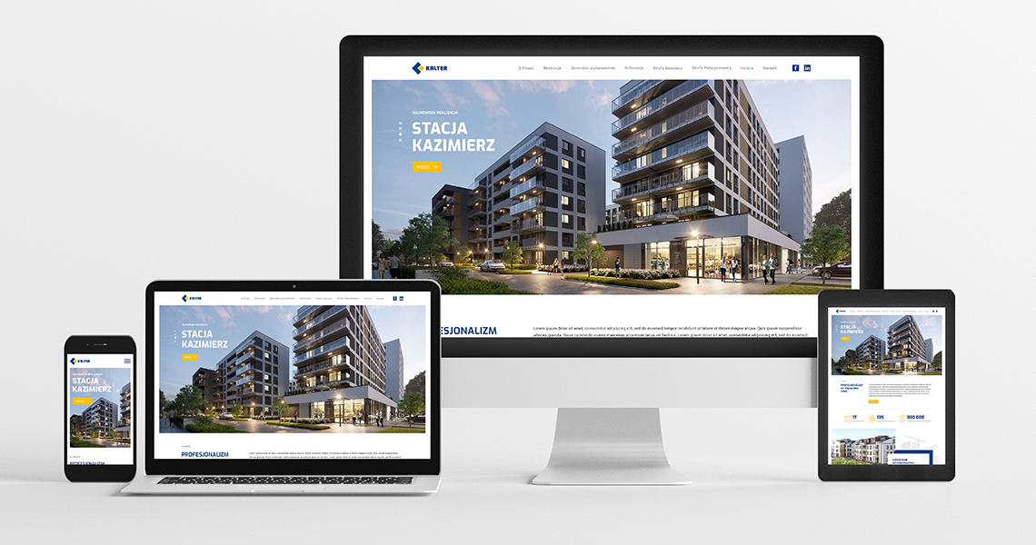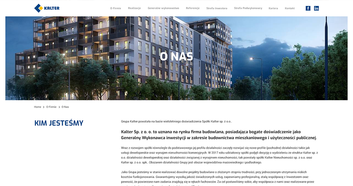Firma Kalter jest generalnym wykonawcą inwestycji w zakresie budownictwa mieszkaniowego i użyteczności publicznej. Dzięki wysokiej jakości świadczonych usług oraz latom doświadczenia zyskała zaufanie wielu klientów. Wobec tego przedsiębiorstwu zależało na stworzeniu profesjonalnej i oryginalnej strony internetowej.