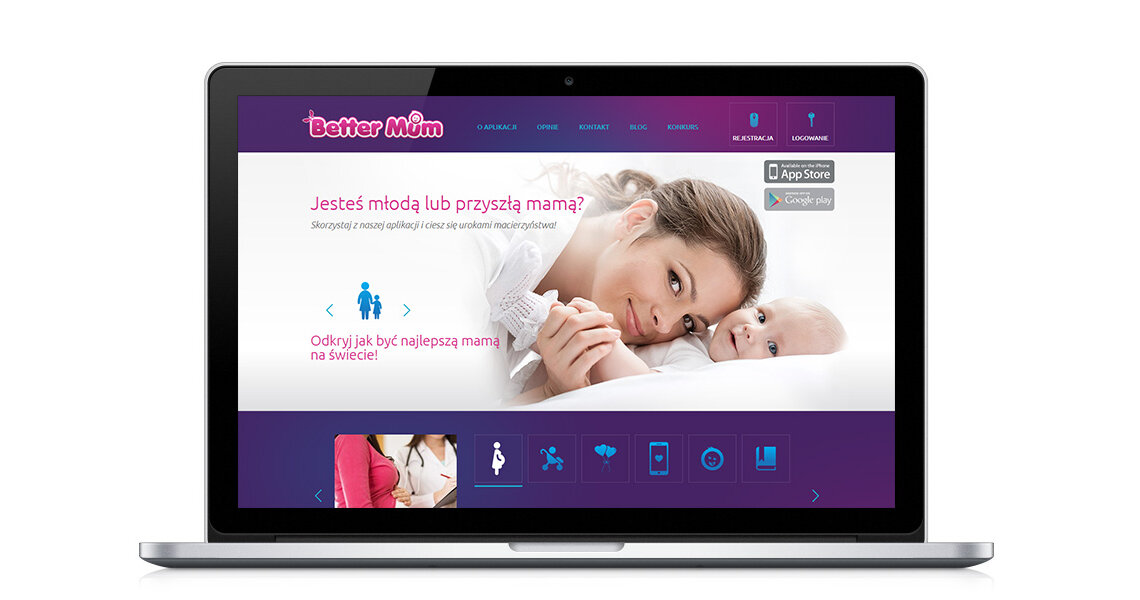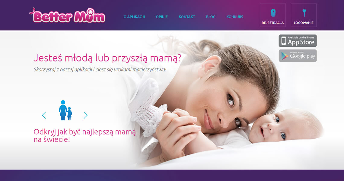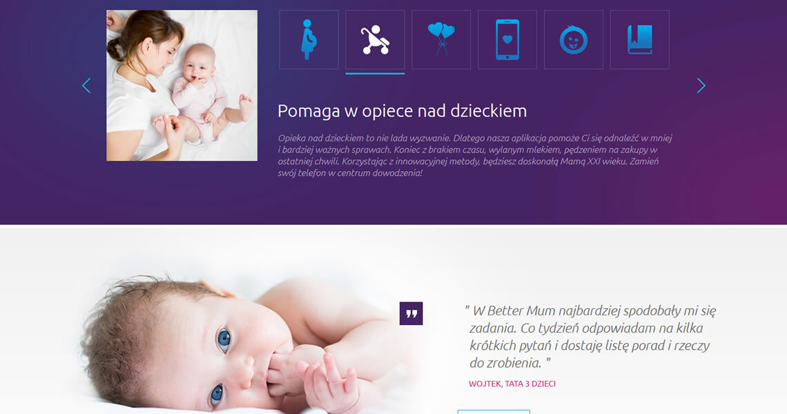 Na landing page’u stworzonym dla Klienta zaprezentowaliśmy najważniejsze funkcjonalności i zalety aplikacji Better Mum. Stworzyliśmy również moduł konkursowy zachęcający użytkowników do przetestowania programu i opisania swoich wrażeń.