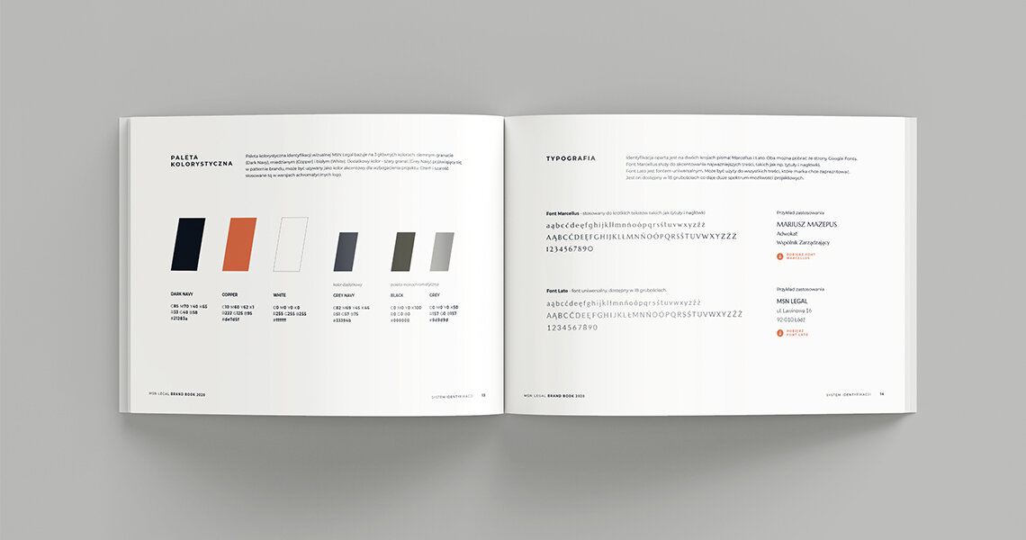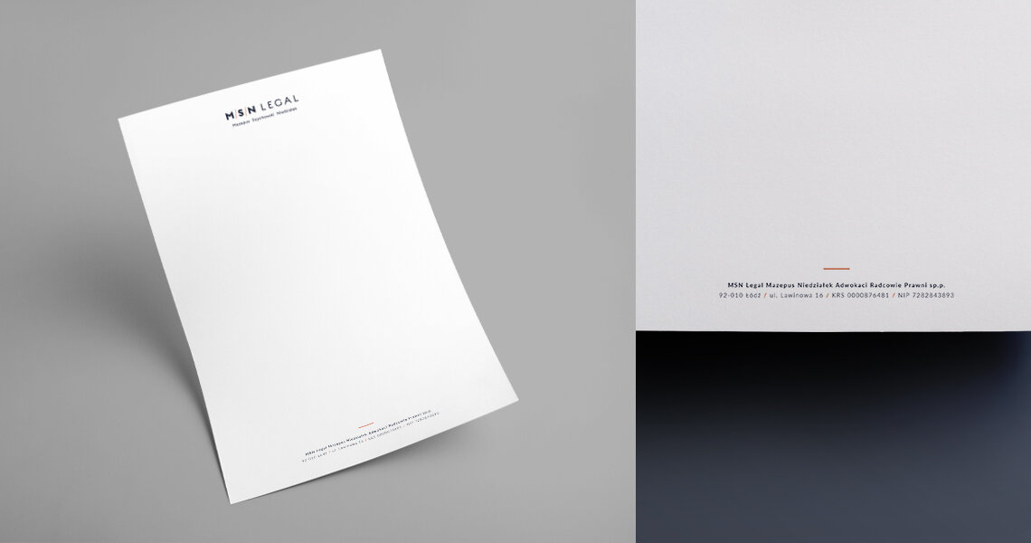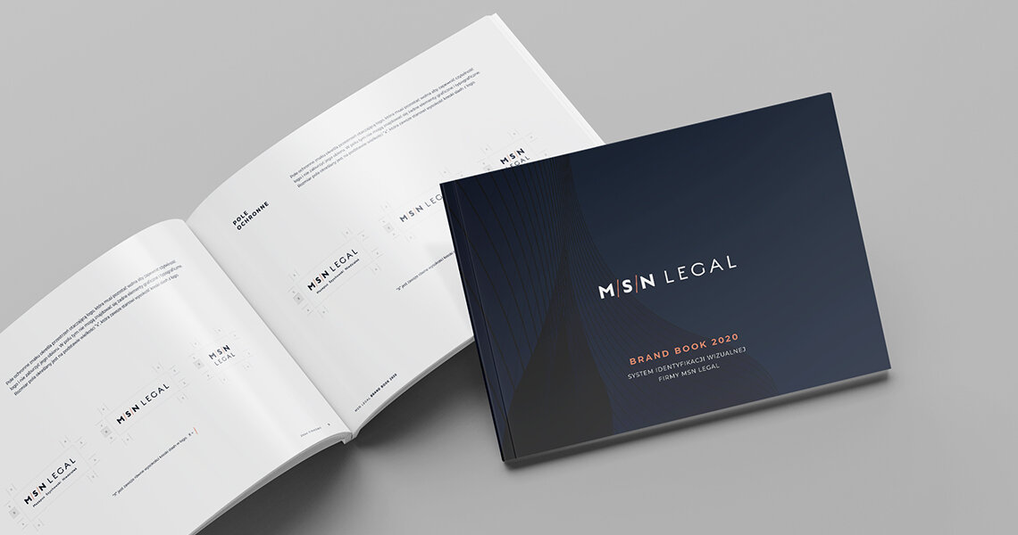 Logo MSN Legal to połączenie nowoczesności i klasyki. Z uwagi na nowatorskie podejście firmy do potrzeb klientów zastosowaliśmy proste, bezszeryfowe fonty. Eleganckie, ponadczasowe kolory – granat oraz miedź – wprowadzone zostały ze względu na tradycyjne wartości marki. Projekt może być spójnym elementem różnych materiałów firmowych. Wszystko zostało dokładnie opisane w nowym brandbooku.