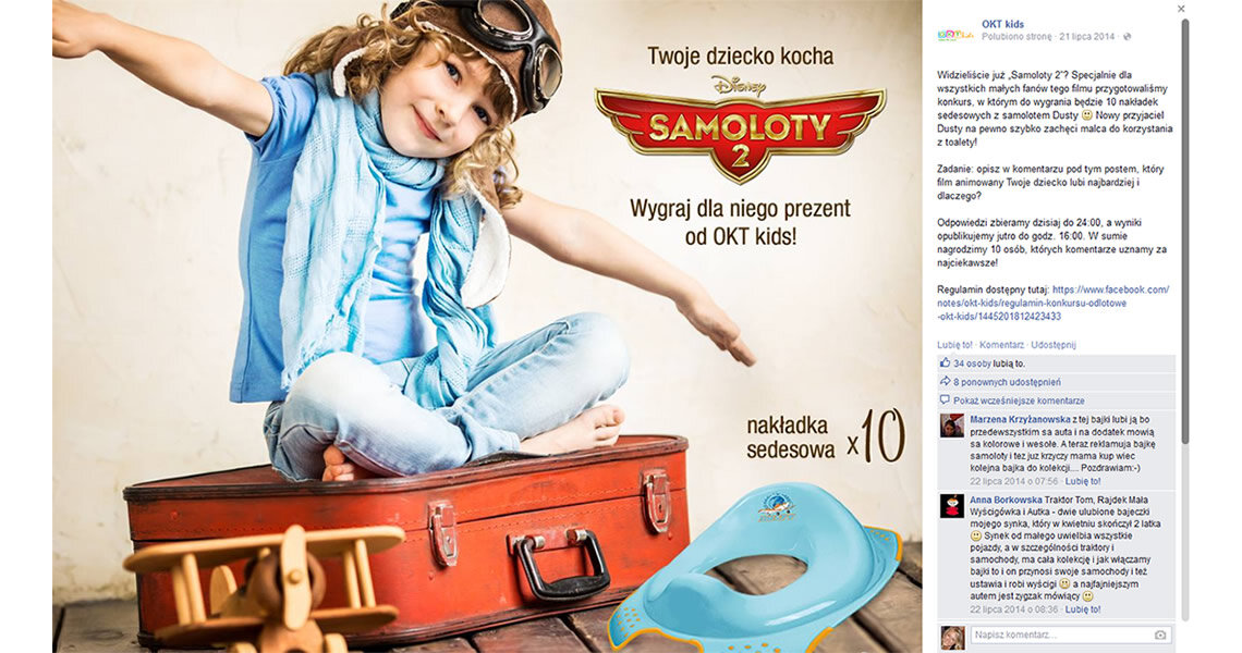 aby zaktywizować fanów. Do wygrania było 10 nakładek sedesowych od OKT kids z serii Samoloty. Specjalnie na potrzeby konkursu, stworzona została dedykowana grafika oraz regulamin. Post był także wspierany kampanią odsłonową.