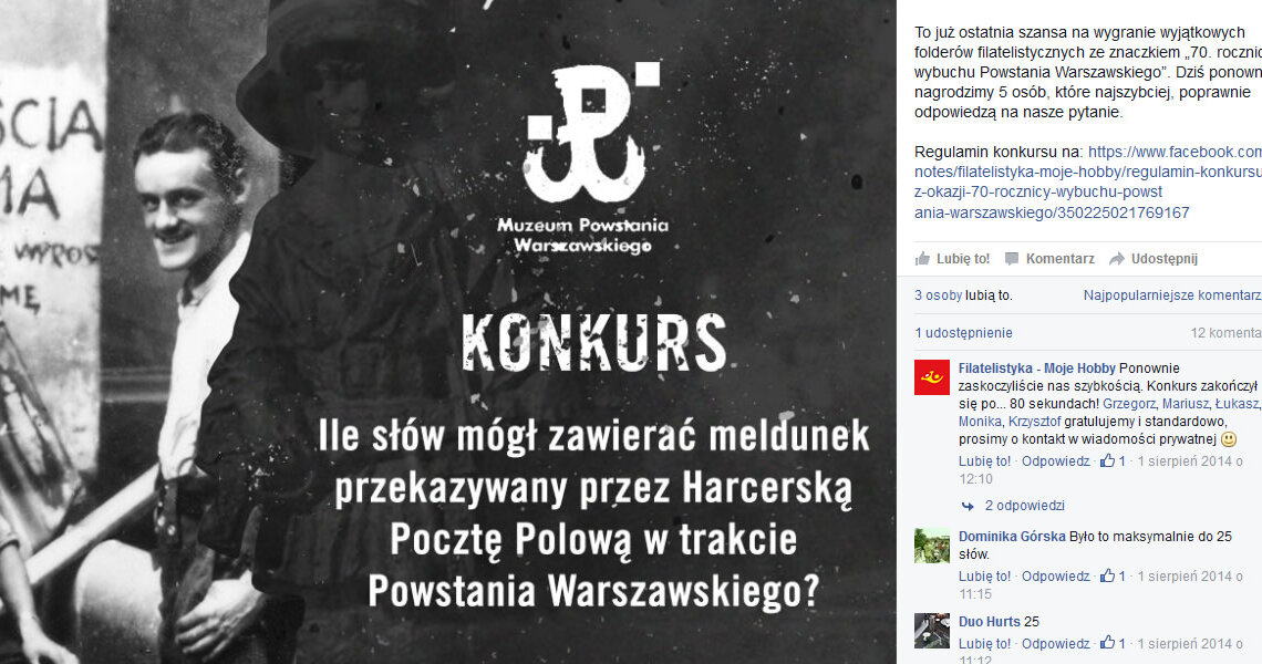 Przez 3 dni, codziennie publikowaliśmy post z pytaniem konkursowym, które nawiązywało do Powstania Warszawskiego i Powstańczej Poczty.