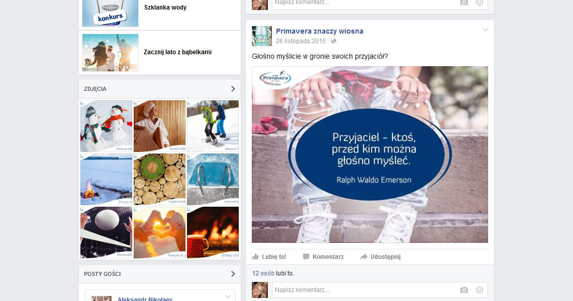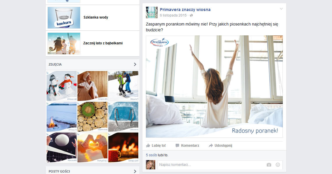 Wychodząc z tego założenia prowadzimy działania w serwisie społecznościowym Facebook dla marki Primavera, naturalnej wody źródlanej, której producentem jest Polska Woda Sp. z o.o. W nawiązaniu do hasła „Żyj pozytywnie!”, na profilu marki zamieszczamy treści budzące pozytywne emocje, a jednocześnie informujemy o produktach i aktualnych działaniach marki.