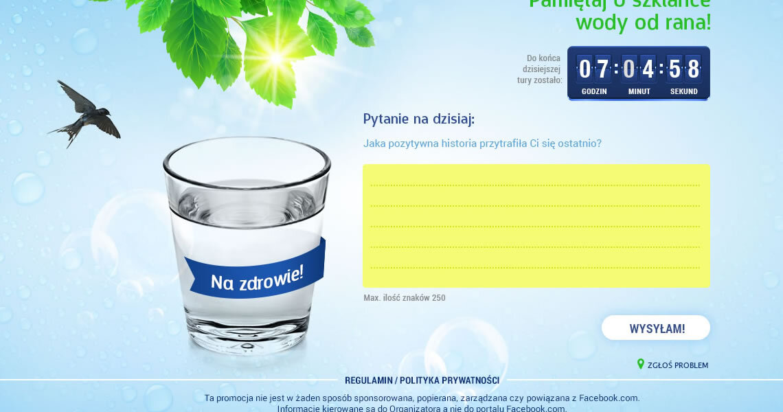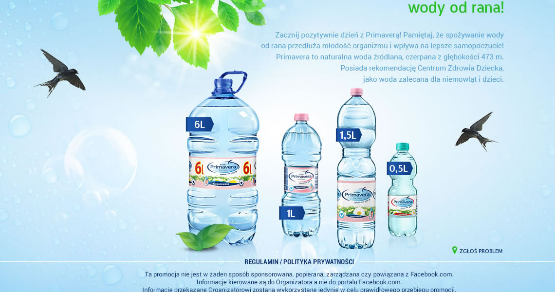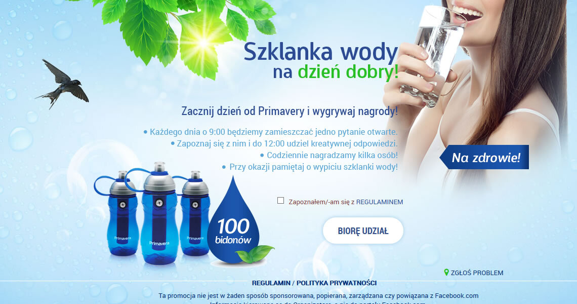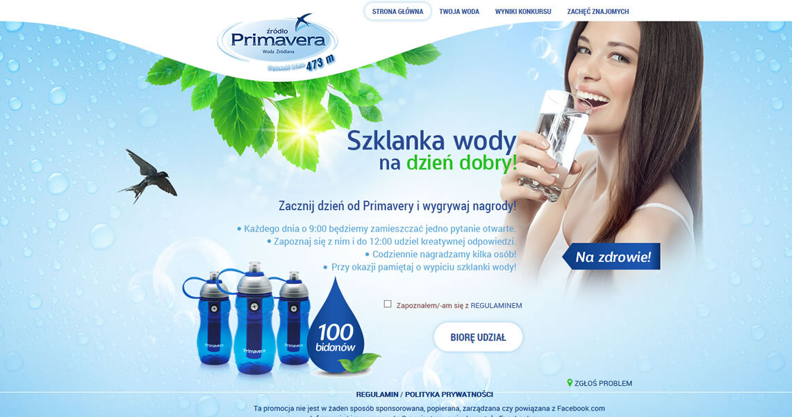 Po szklankę wody źródlanej najlepiej sięgnąć już od samego rana! Chcąc wypromować ten dobry nawyk wśród potencjalnych klientów marki Primavera, przygotowaliśmy konkurs w formie aplikacji na serwisie Facebook. Każdego dnia od rana, podczas trwania konkursu, w aplikacji pojawiało się pytanie otwarte związane z piciem wody oraz stylem życia.
