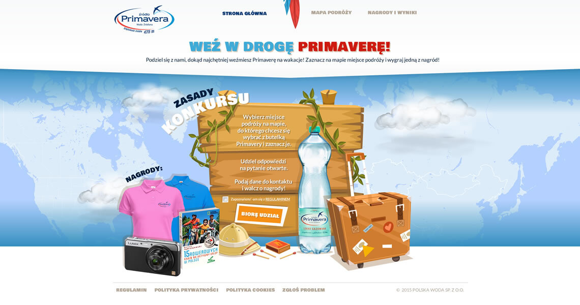 Konkurs na stronie www.polskawoda.pl polegał na zaznaczeniu miejsca na interaktywnej mapie świata, do którego najchętniej zabierze się butelkę wody Primavera oraz uzasadnieniu wyboru. Internauci chętnie dzielili się swoimi planami oraz marzeniami. Podczas trwania konkursu napłynęło 1243 zgłoszeń.