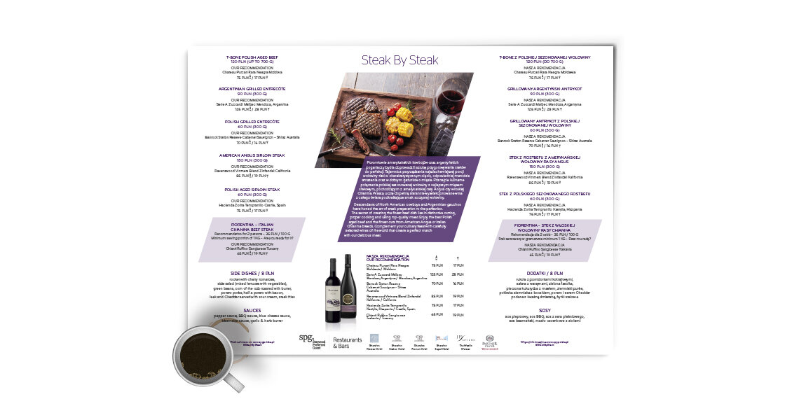 Tym razem nasz dział Design opracował całościowy projekt graficzny oferty promocyjnej „Steak By Steak”, w ramach której promowaliśmy steki i wina z różnych regionów świata. Oferta objęła swoim zasięgiem restauracje hoteli Sheraton w Warszawie, Sopocie, Poznaniu i Krakowie.