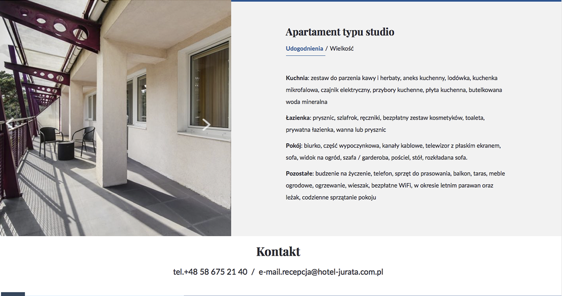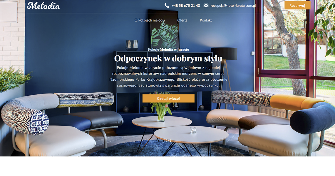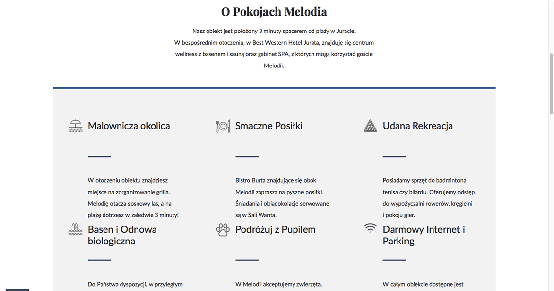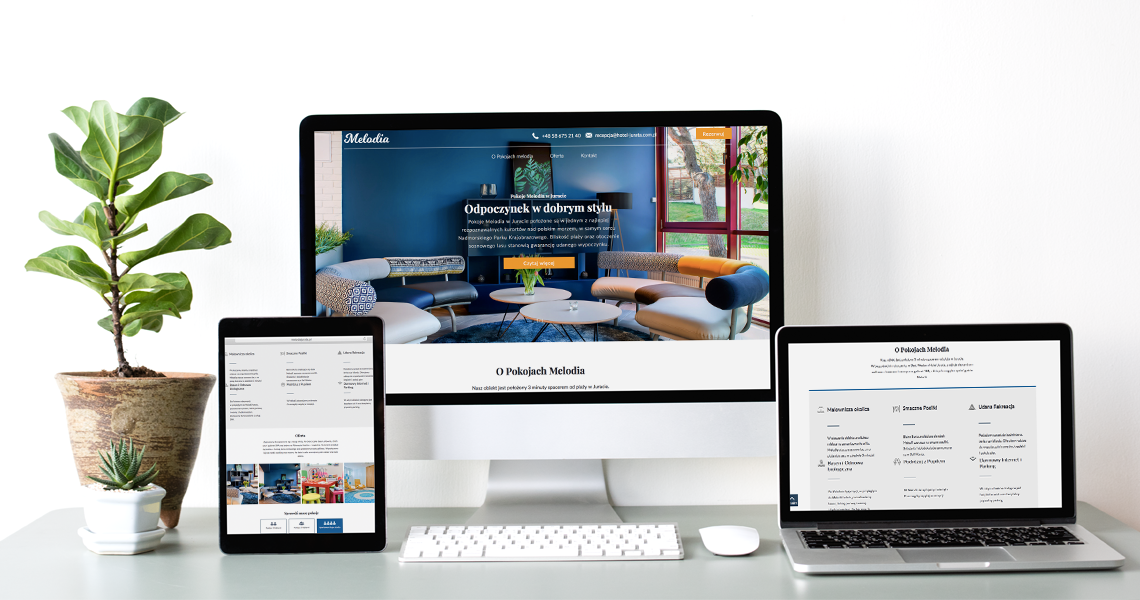 Dla obiektu Melodia Jurata stworzyliśmy atrakcyjną i funkcjonalną stronę internetową www.melodiajurata.pl. Witryna skonstruowana została z wykorzystaniem technologii RWD (Responsive Web Design) oraz na bazie układu jednostronicowego (one page). Nasz kosmiczny zespół zadbał również o przygotowanie spójnej i prostej grafiki prezentującej wystrój pokoi oraz okolicę hotelu. Nowopowstała witryna została wzbogacona o atrakcyjne rozwiązania i dodatki, które ułatwiają dostęp do informacji na temat oferty oraz lokalizacji obiektu, a tym samym podkreślają wyjątkowość tego miejsca.