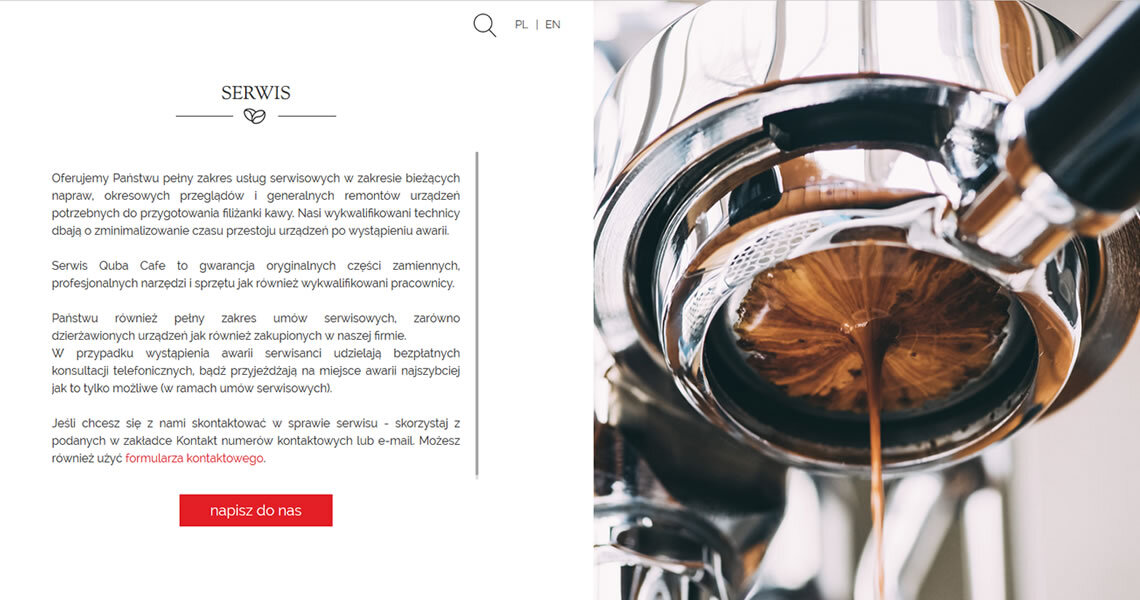Quba Caffe to pachnący świeżo mieloną kawą serwis, w którym każdy miłośnik czarnego napoju – zarówno amator, jak i profesjonalista – znajdzie wszystko, czego mu trzeba: szeroki wybór najlepszej jakości ziaren, profesjonalny sprzęt i akcesoria, a do tego fachową wiedzę i techniczne wsparcie w razie wszelkich kawowych awarii. Strona w nowej, ATOM-owej odsłonie, stała się bardziej przejrzysta i przyjazna użytkownikom, którzy dzięki zaawansowanym opcjom filtrowania dostępnych na stronie produktów oraz sortowania ich w określonej kolejności, mogą jeszcze szybciej i wygodniej wyszukiwać interesujące ich artykuły. Serwis został rozszerzony również o bogatą w merytoryczne treści sekcję blogową, w której Nasz Klient może dzielić się z użytkownikami profesjonalną wiedzą, poradami i ciekawostkami ze świata kawy i herbaty.