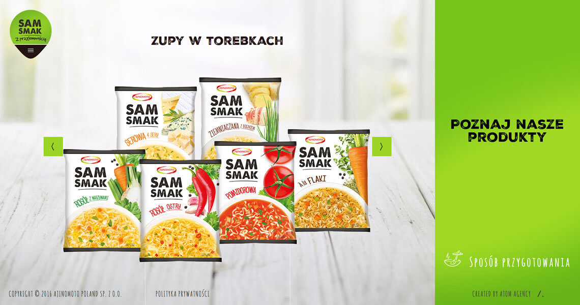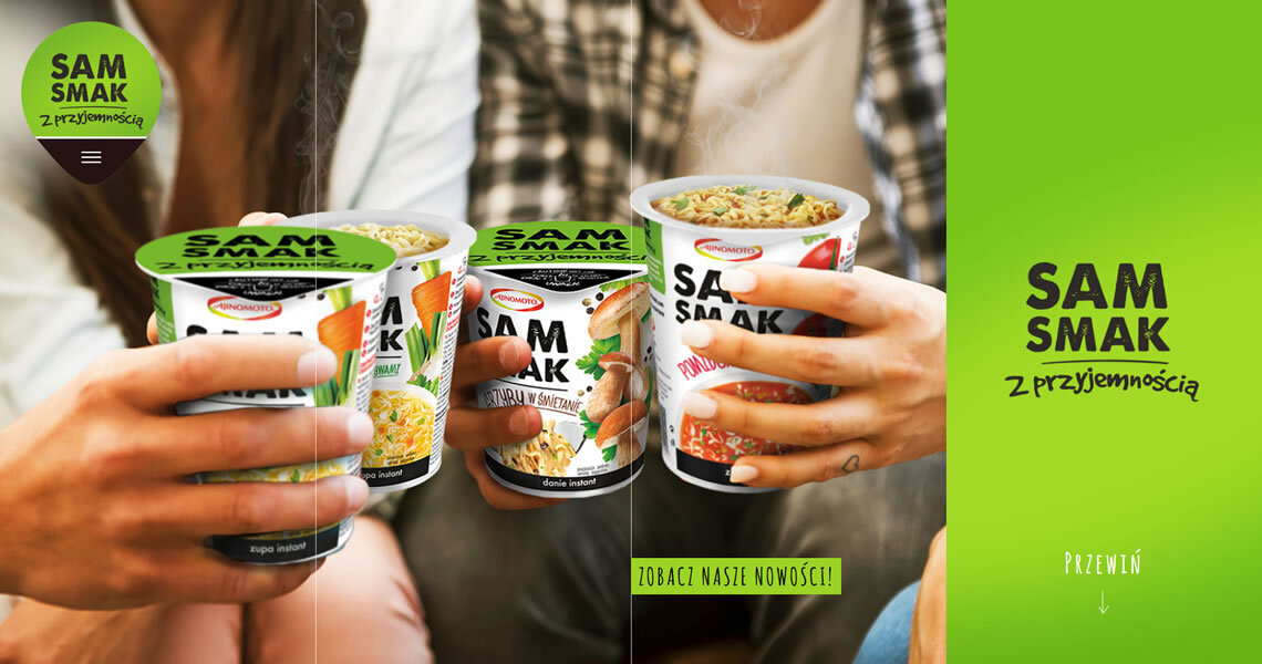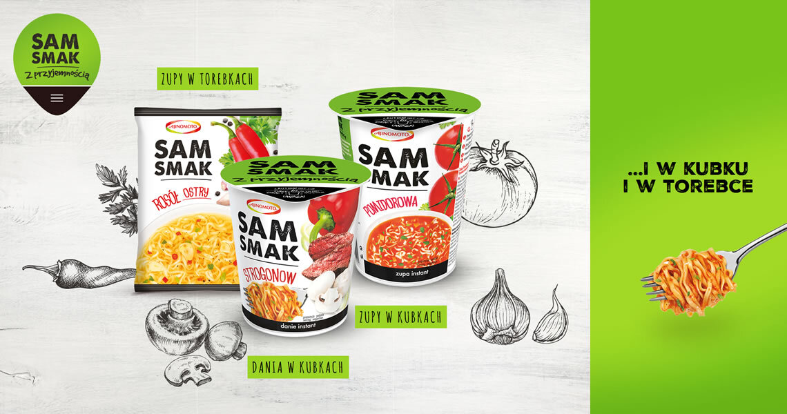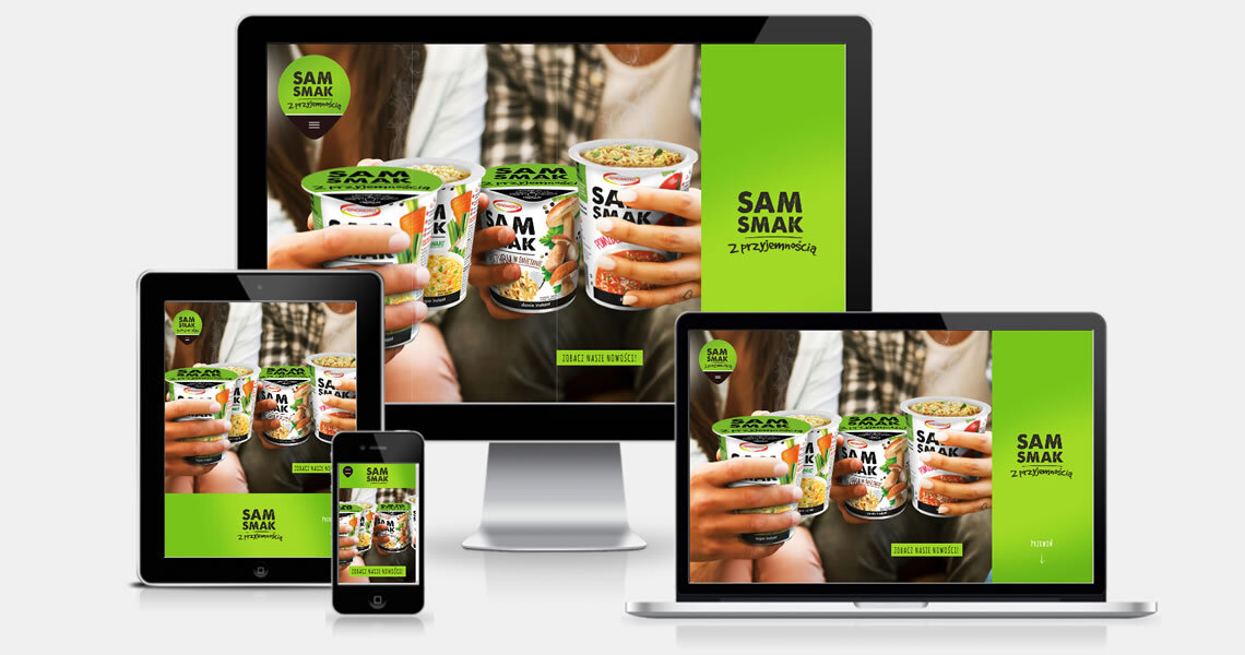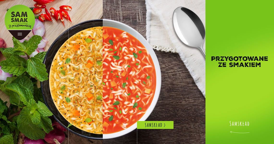 Sam smak to marka oferująca zupy i dania instant w kubkach oraz zupy instant w torebkach. Stworzyliśmy stronę, której głównym celem było zaprezentowanie apetycznych grafik produktów. Z uwagi na grupę odbiorców, projekt wykonany został w technologii Responsive Web Design, co oznacza, że witryna wyświetla się idealnie na każdym rozmiarze wyświetlacza. Wartością dodaną są informacje nt. składu poszczególnych produktów. Użytkownik dowie się z nich, który wariant smakowy zawiera jego ulubione dodatki. Strona zawiera informacje dotyczące dostępności produktów oraz dane kontaktowe, co czyni z niej doskonałe źródło wiedzy o marce. Przejrzysty układ oraz soczysta, kolorowa forma, odzwierciedlają przyjazny stosunek marki Sam Smak do Klienta.