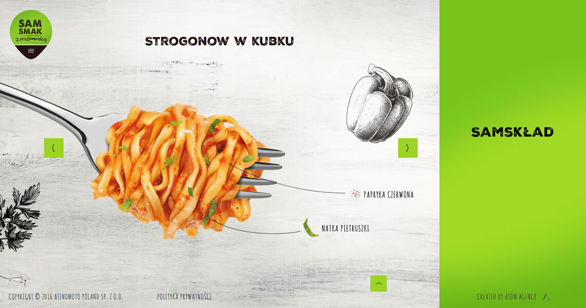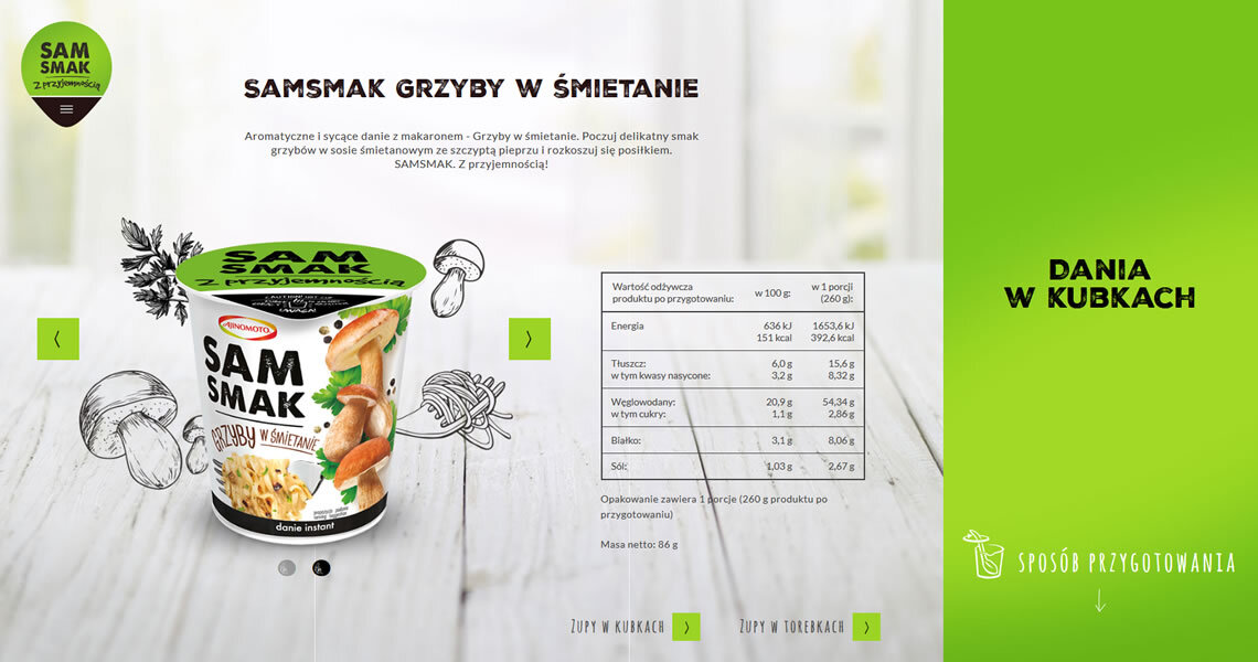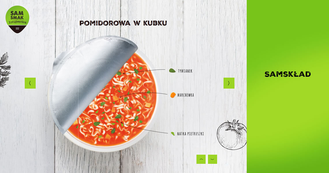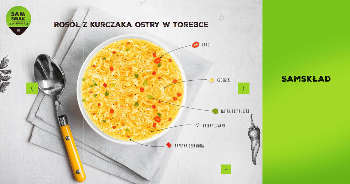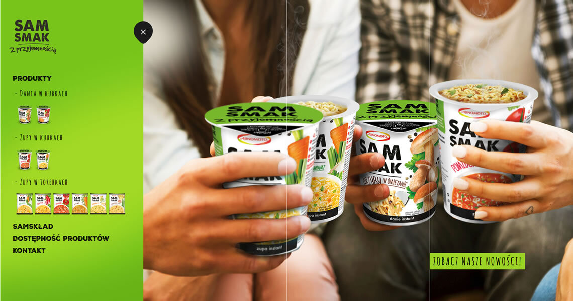 Sam smak to marka oferująca zupy i dania instant w kubkach oraz zupy instant w torebkach. Stworzyliśmy stronę, której głównym celem było zaprezentowanie apetycznych grafik produktów. Z uwagi na grupę odbiorców, projekt wykonany został w technologii Responsive Web Design, co oznacza, że witryna wyświetla się idealnie na każdym rozmiarze wyświetlacza. Wartością dodaną są informacje nt. składu poszczególnych produktów. Użytkownik dowie się z nich, który wariant smakowy zawiera jego ulubione dodatki. Strona zawiera informacje dotyczące dostępności produktów oraz dane kontaktowe, co czyni z niej doskonałe źródło wiedzy o marce. Przejrzysty układ oraz soczysta, kolorowa forma, odzwierciedlają przyjazny stosunek marki Sam Smak do Klienta.