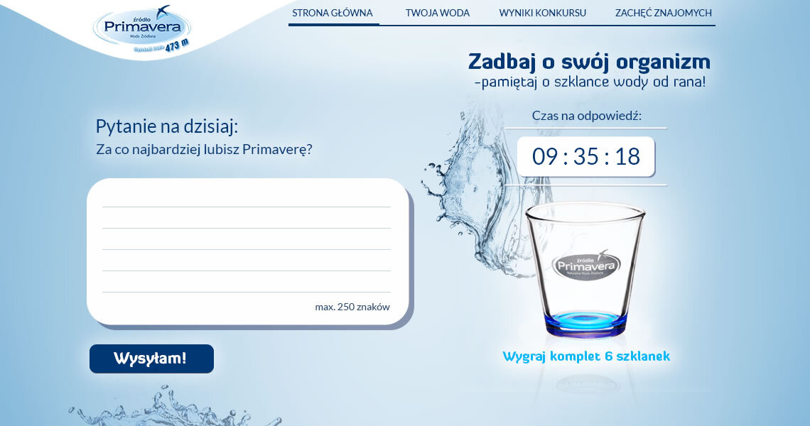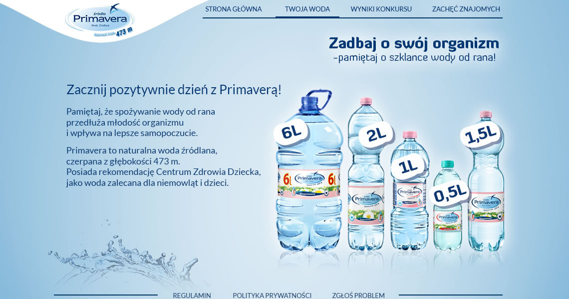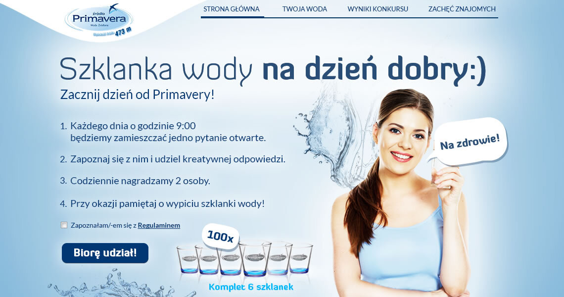 W wyniku ogromnego sukcesu pierwszej edycji konkursu "Szklanka wody na dzień dobry!", marka Primavera postanowiła kontynuować źródlane działania. Chcąc edukować i promować nawyk picia wody wśród potencjalnych Klientów marki, przygotowaliśmy kolejną odsłonę konkursu w formie aplikacji na serwisie Facebook. I tym razem użytkownicy chętnie odpowiadali na pytania otwarte związane z piciem wody oraz zdrowym stylem życia.