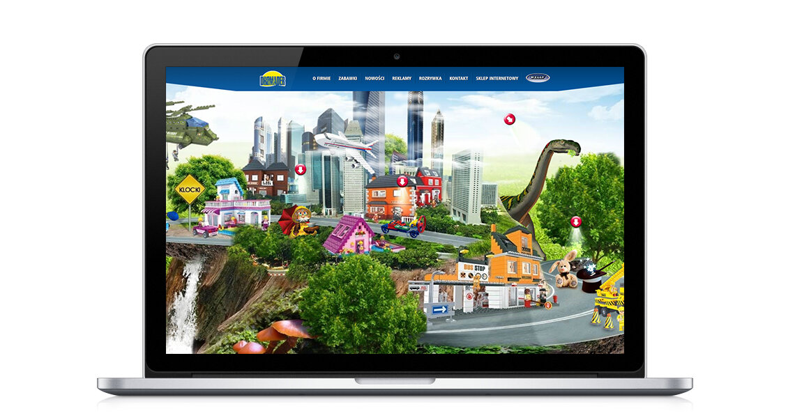 Strona została podzielona na dwa moduły - produktowy oraz rozrywkowy (pokoje tematyczne promujące indywidualną linię zabawek jak np. Magiczne Rozmaitości). W pierwszym produkty są prezentowane w sposób tradycyjny, w drugim prezentacja produktów jest wzbogacona o liczne ciekawostki i animacje. Całość wzbogaciliśmy rozbudowaną zakładką z rozrywką dla najmłodszych.