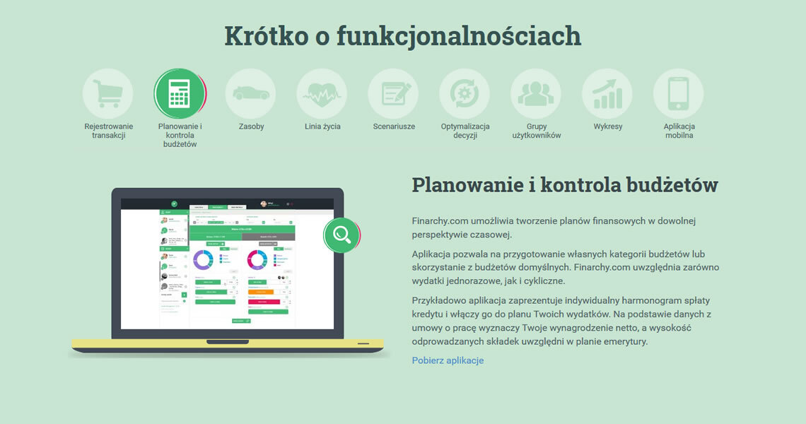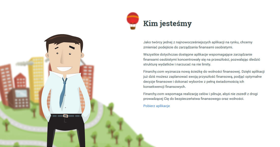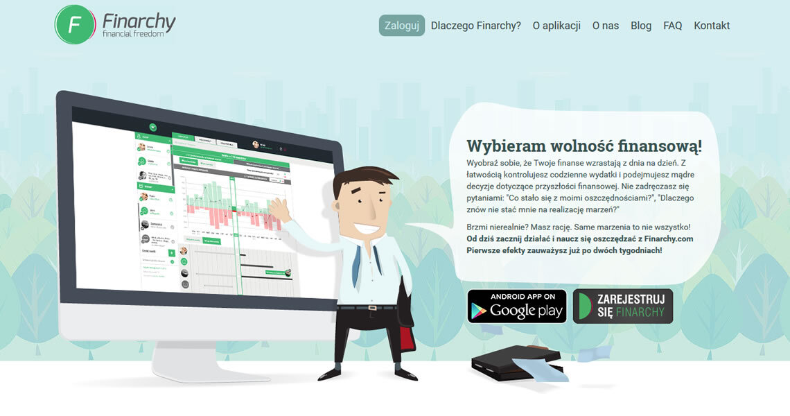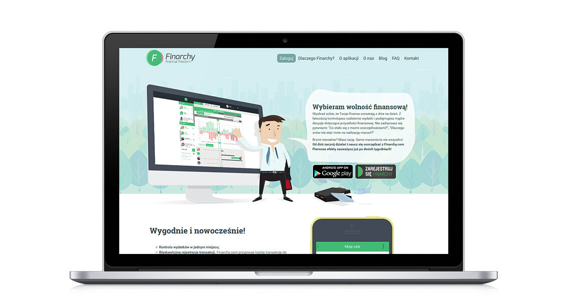 za przygotowanie strony internetowej, w całości poświęconej wspomnianej aplikacji. Doskonale zdajemy sobie sprawę, że tak innowacyjny projekt jak Finarchy wymaga zastosowania nowoczesnych rozwiązań. Wybór padł na technikę Parallax Scrolling i Flat Design. Pozwoliło to w prosty i czytelny sposób zaprezentować najważniejsze funkcje, aktualności i informacje o samym projekcie. Dodatkowo podczas przeglądania strony, towarzystwa dotrzyma nam również finansowo wyzwolony brand hero.