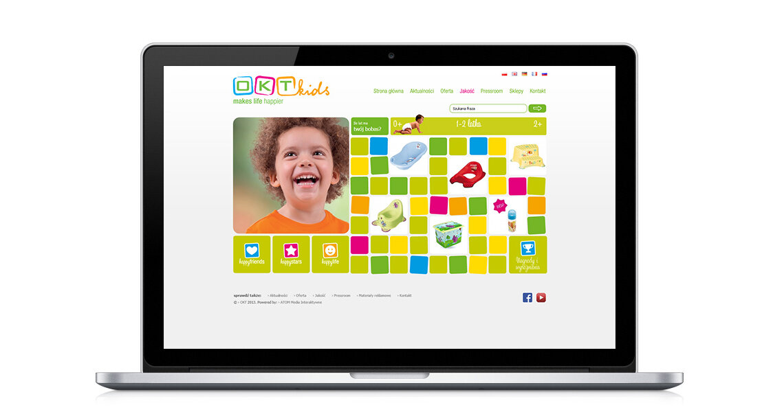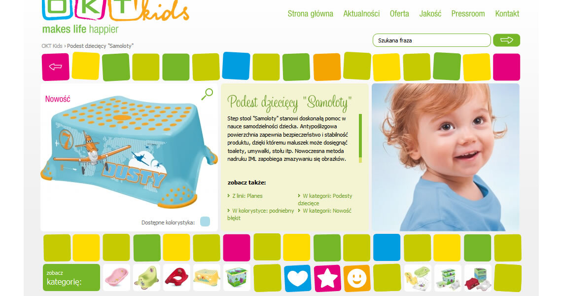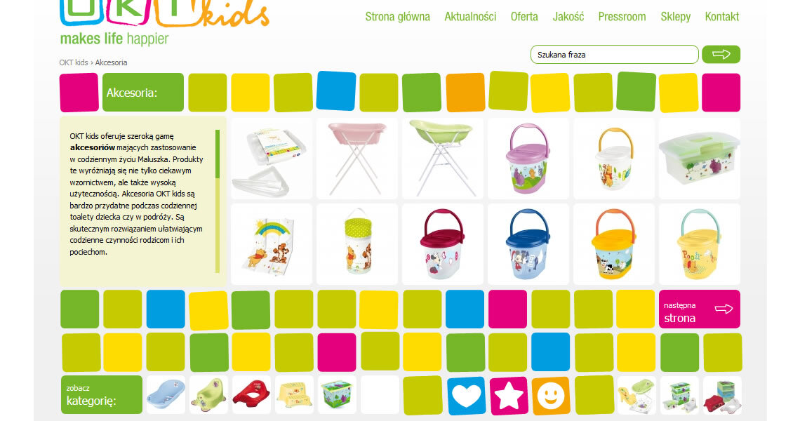 Projekt, który stworzyliśmy to kolejna odsłona graficzna dla jednej z marek OKT. Zgodnie z nową strategią rebrandingową wykonaliśmy stronę, dokładając swoją cegiełkę do budowy nowego brandu. Naszym celem było stworzenie serwisu, po którym użytkownik porusza się w sposób intuicyjny. Stąd wiele funkcjonalności i kategorii, pomagających w łatwym odszukiwaniu produktów pod względem ich rodzaju, koloru, wieku dziecka oraz linii produktowych. Na stronie znajduje się również Kącik Rodzica oraz