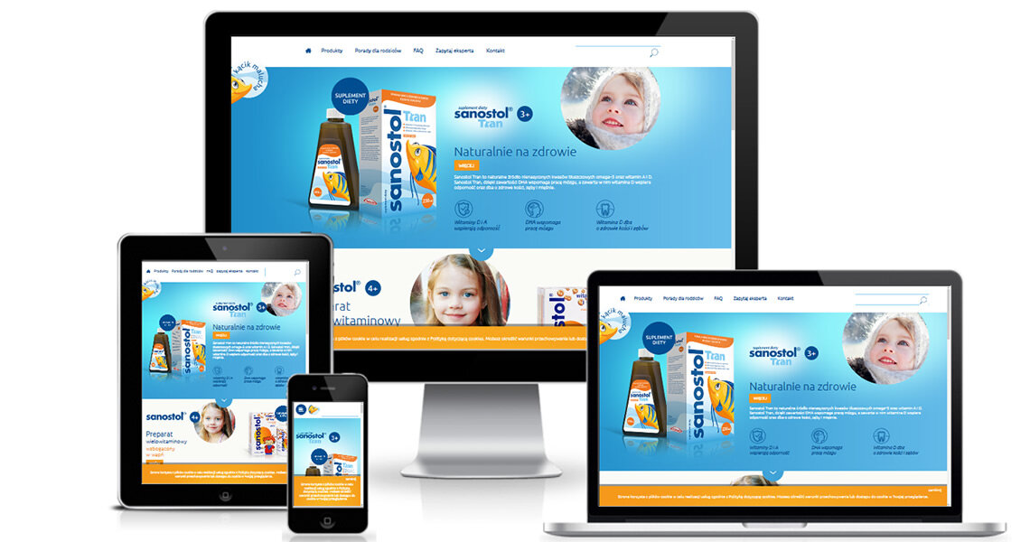 Nasza długotrwała współpraca zaowocowała kolejnymi projektami - tym razem kreacją i wdrożeniem nowej strony internetowej. Serwis miał przede wszystkim w sposób czytelny zaprezentować trzy wiodące produkty marki, w tym najnowszy - tran. Cele postawione przez Klienta: przejrzystość, nowoczesność i merytoryka - zostały w pełni zrealizowane. Witryna internetowa w RWD, intuicyjna w obsłudze to doskonały przykład dobrze wykonanego zlecenia. Warto podkreślić, iż stworzona na stronie sekcja Porady dla rodziców, stanowi doskonałą podstawę do budowania content marketingu i pozycjonowania marki w Internecie – również przez naszą agencję.