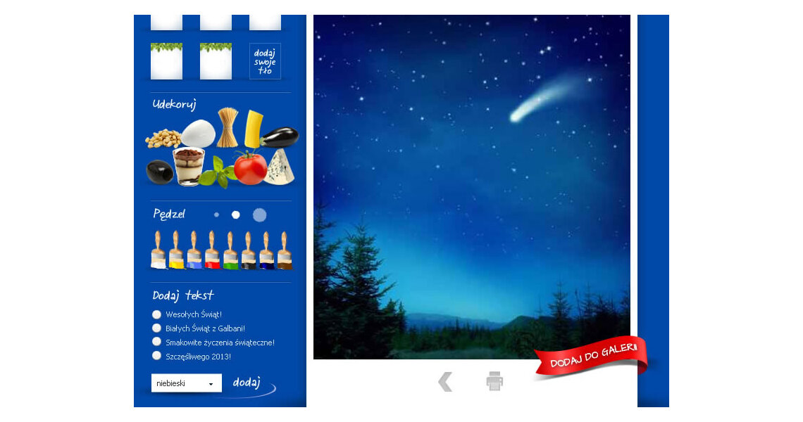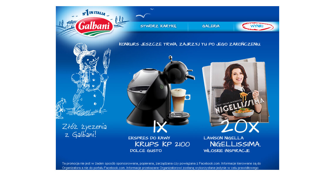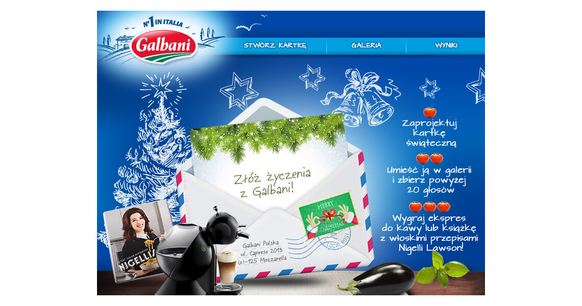 Aplikacja konkursowa „Złóż życzenia z Galbani”, w ramach której zachęciliśmy użytkowników Facebooka do samodzielnego zaprojektowania kartki świątecznej, wykorzystując takie funkcjonalności jak m.in. własne tło, elementy do dekoracji, jak również wstawić własny napis. Przygotowane w ten sposób kartki można było drukować, udostępniać na swoim profilu, wysyłać znajomym